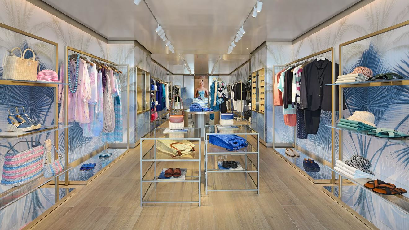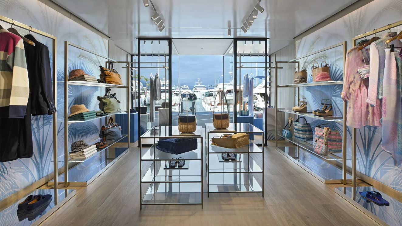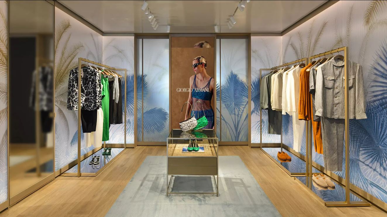 L’espace se distingue par un design intérieur associant sobriété contemporaine et matériaux nobles : marbre, bois sombre et métaux polis se combinent pour créer une atmosphère à la fois apaisante et exclusive. Un éclairage subtil et maîtrisé met en valeur les éléments architecturaux et les produits phares, offrant une expérience d’achat immersive, en parfaite cohérence avec l’image premium de Giorgio Armani, figure emblématique du secteur du luxe.