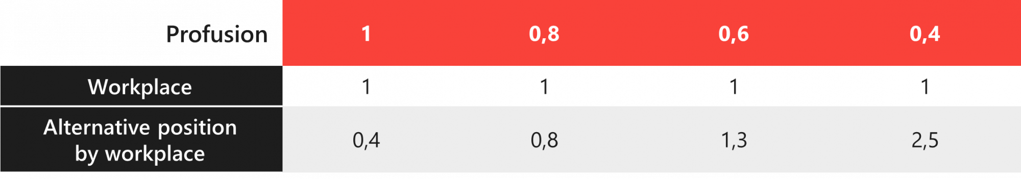 So zeigt eine Fülle von 30: 100 an, dass nur ein Teil der Angemeldeten in der Lage sein wird, den Standort gleichzeitig aufzusuchen. Die effektive Ausdehnung für die Nutzer zum Zeitpunkt T ist höher, in den meisten Fällen größer als 55: 100. Benchmark- und Nutzungsprognosestudien ermöglichen Trendprojektionen, um die verschiedenen Arbeitspositionen zu bestimmen, die je nach gewähltem Ausbau eingerichtet werden müssen. Es wird allgemein angenommen, dass je mehr Stellen geteilt werden, desto mehr alternative Stellen benötigt werden. Der englische Berater Neel Usher ist der Ansicht, dass in jedem Fall 1,4 Arbeitsplätze pro Person vorhanden sein sollten: bei einem Arbeitsplatz pro Mitarbeiter sollten 0,4 Arbeitsplätze in Besprechungsräumen und Alternativen bereitgestellt werden; bei 0,7 Arbeitsplätzen pro Mitarbeiter sind es 0,7. In seinem Leitfaden zum Activity Based Working gibt Juriann Van Meel leicht abweichende Verhältnisse an, die aber der gleichen Logik folgen.