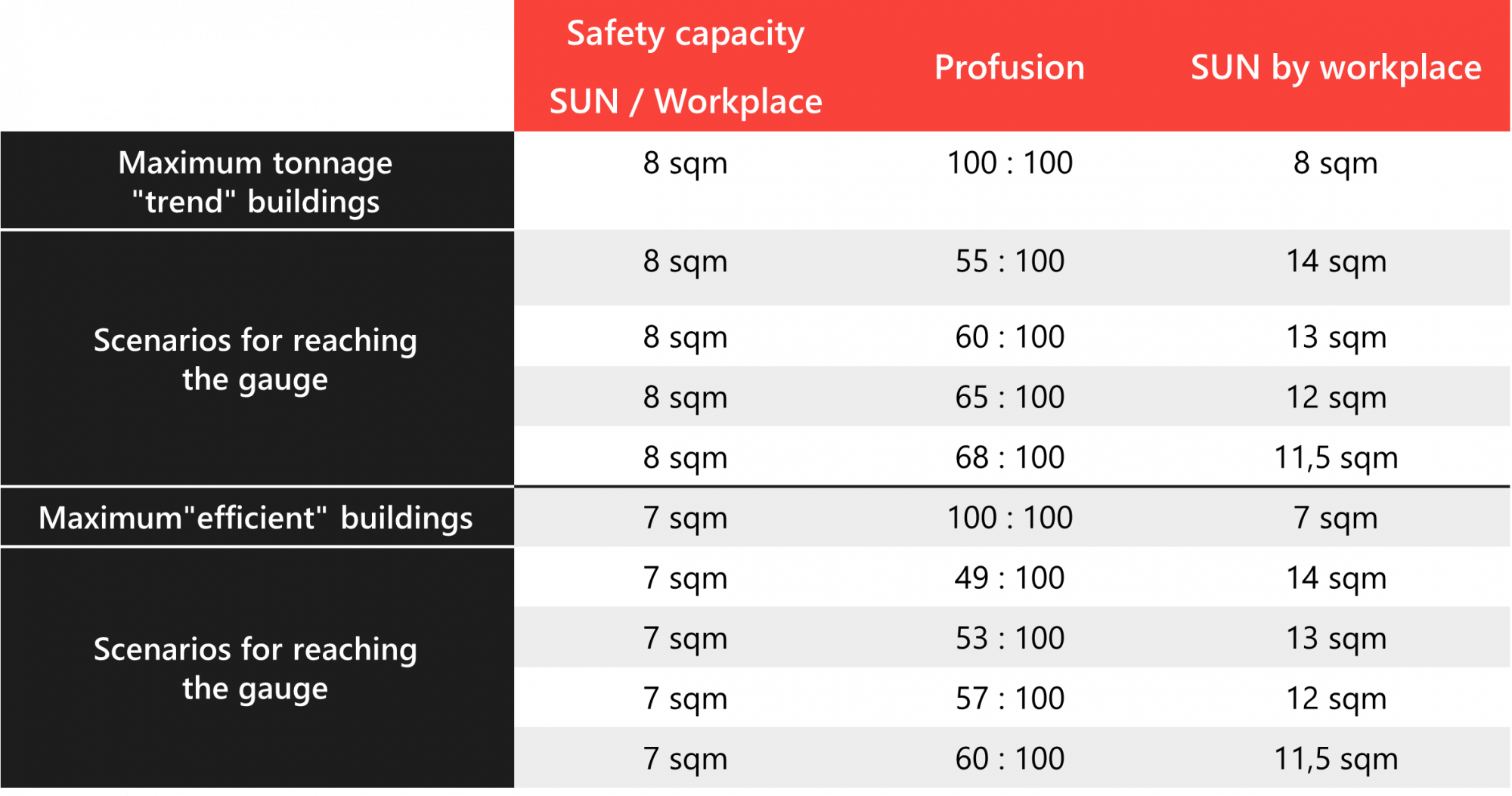 Die nachstehende Tabelle enthält Richtwerte für die maximale Ausdehnung und die damit verbundenen Flächen pro Station, ab denen eine Überschreitung des Richtwerts wahrscheinlich ist. Es werden zwei Szenarien vorgestellt: so genannte "Trend"-Gebäude, die den meisten für diese Simulation untersuchten Gebäuden entsprechen, und "High-Performance"-Gebäude, bei denen es sich häufig um neuere Projekte handelt, die mit mehreren Mietern vermarktet werden sollen und deren Flächen relativ klein sind (weniger als 1000 m²). Für die erstgenannten Gebäude wird die Sicherheitskapazität häufig mit etwa 8 m² pro Person vor Ort bemessen. Bei letzteren liegt sie bei etwa 7 m². Bevor wir weitergehen, ist es interessant festzustellen, dass die Kapazitäten für zugewiesene oder gemeinsam genutzte Arbeitsplätze überdimensioniert sind, wie es vor der Krise der Fall war, selbst in den innovativsten Szenarien (Erweiterung nahe 65: 100). Für jede Erweiterung ist eine Fläche pro Station angegeben. Je größer die Ausdehnung, desto mehr Fläche pro Arbeitsplatz: Die Anzahl der Arbeitsplätze ändert sich umgekehrt zur Anzahl der Arbeitsplätze für die Zusammenarbeit. In diesen Szenarien ist der Begriff des Arbeitsplatzes ein Input, was zählt, ist die Anzahl der zugehörigen Mitarbeiter. In all diesen Szenarien wird also davon ausgegangen, dass die gleiche Anzahl von Mitarbeitern gleichzeitig vor Ort ist - diese Anzahl wird durch die Sicherheitskapazität festgelegt.