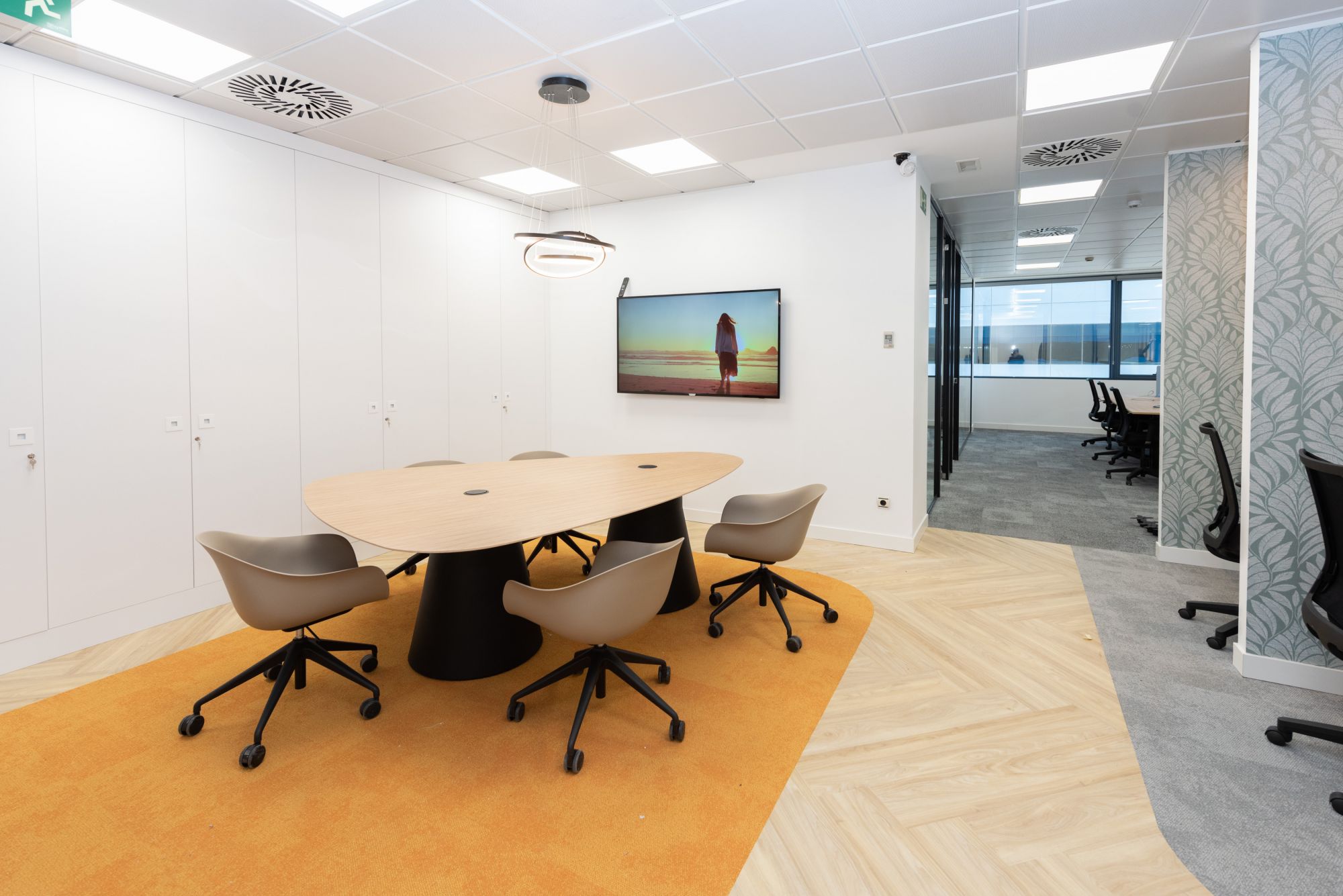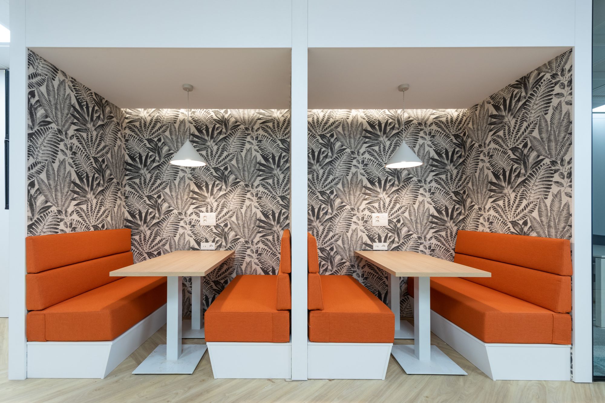 Para las zonas de trabajo de las oficinas, se ha seguido una estética moderna y funcional, introduciendo colores y detalles diferenciales en phonebooth, salas colaborativas, mobiliario informal…