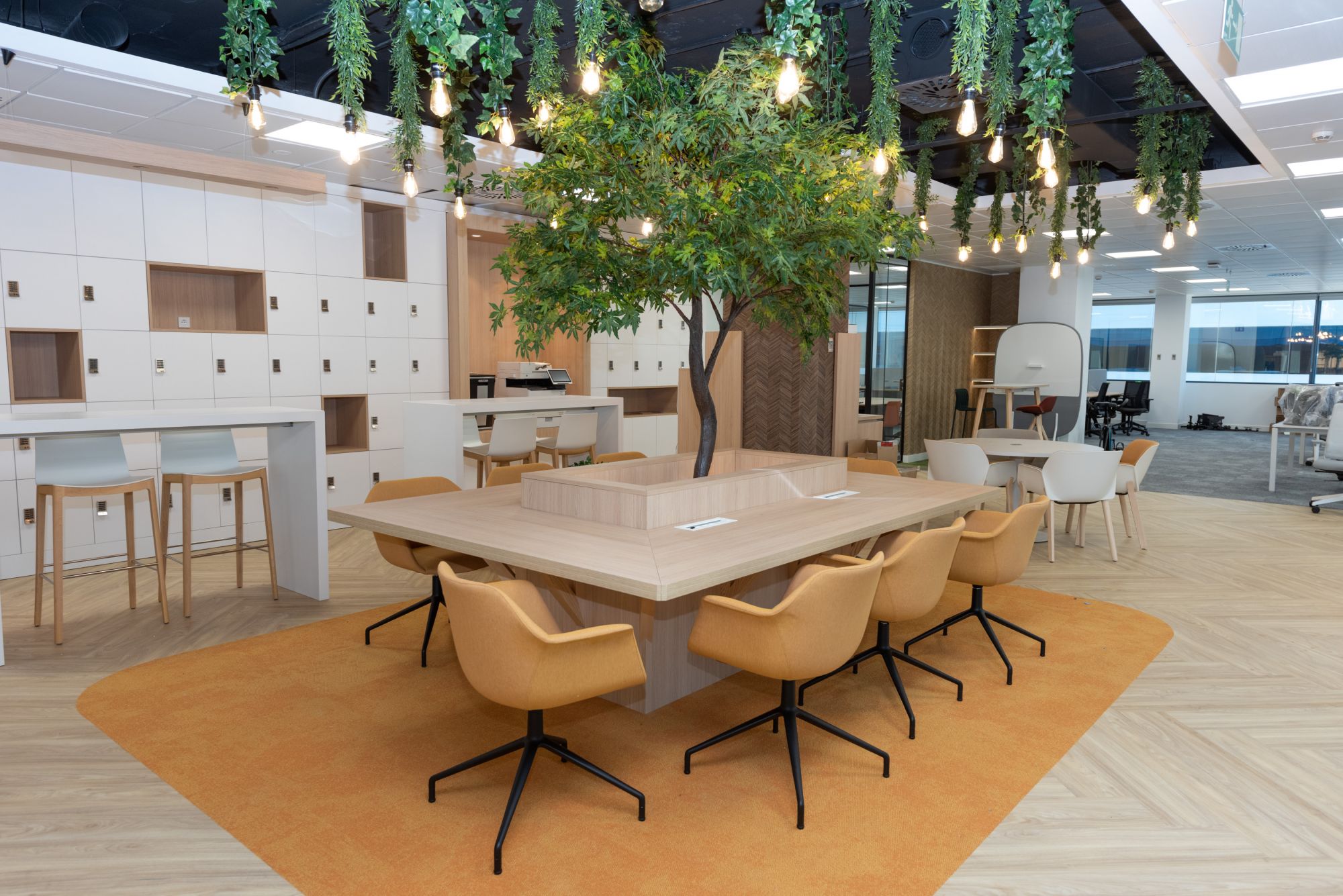 El área central, la cual denominamos “Plaza”, se diseñó como punto de encuentro de los trabajadores. Para ello se utilizó un diseño de iluminación y materiales cálidos en el mobiliario, suelos y paredes, combinados con elementos vegetales con gran protagonismo en la estética final. Se optó también por un techo abierto con instalaciones vistas, para dotar al espacio de una mayor escala y apertura visual.