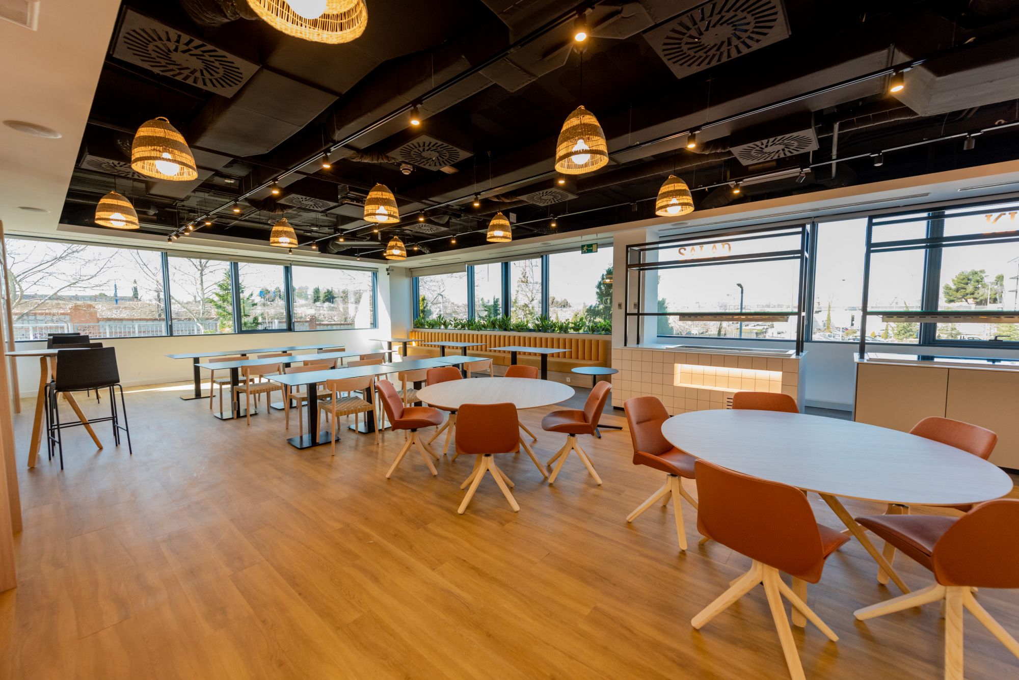 En la construcción de sus oficinas, el cliente quería conseguir un espacio de trabajo moderno y flexible, con espacios abiertos y multiuso, y la inclusión de un work-café como escaparate de los servicios de restauración y catering que ofrece la compañía.