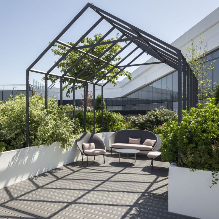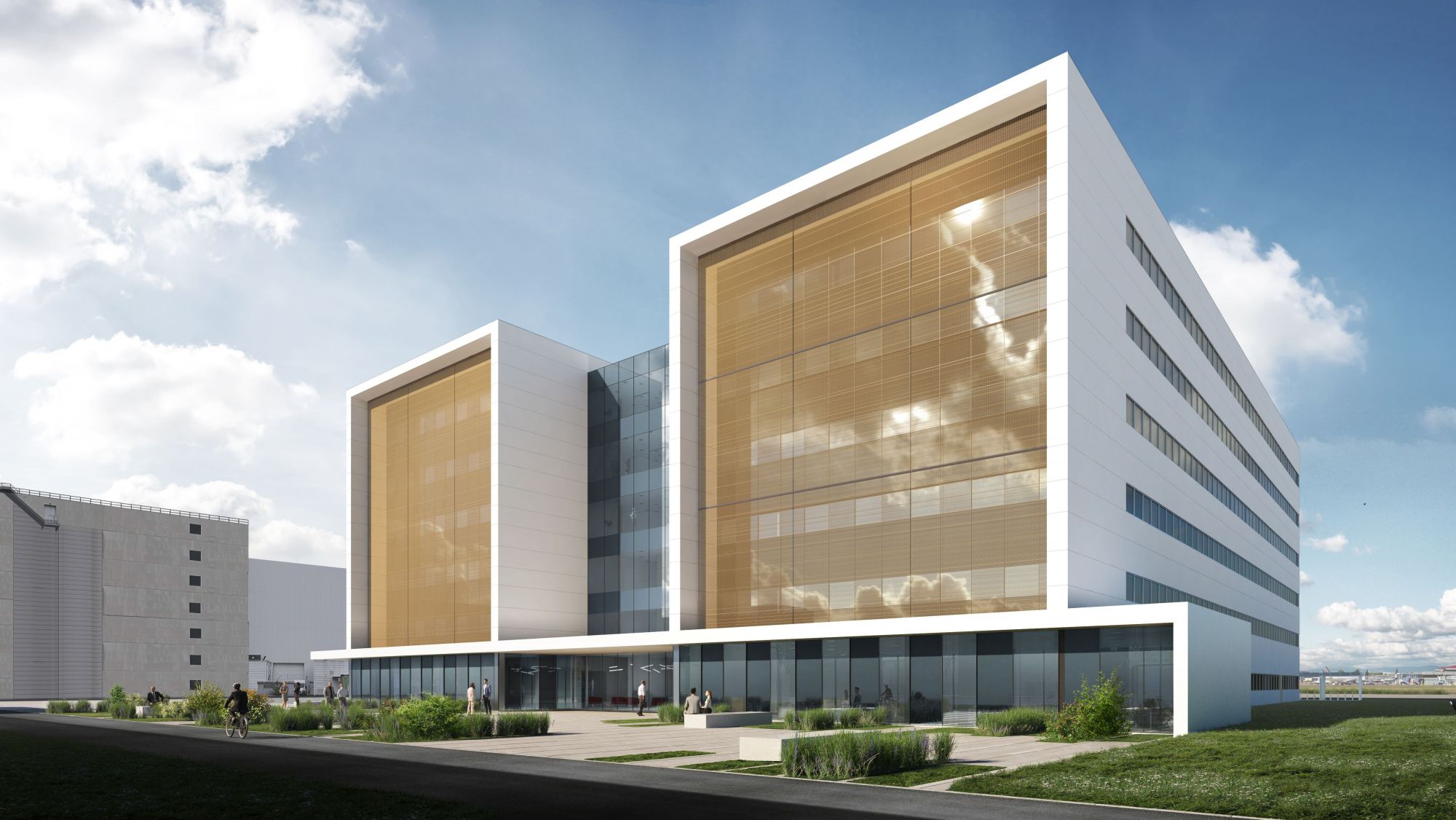 Ces deux volumes sont posés sur un socle en béton filant sur un parvis végétalisé. Ils adoptent des matériaux contemporains et s’affirment par une peau de verre de trame horizontale. Le traitement de la façade Sud est matérialisé par une résille métallique de couleur or, affirmant l’élégance des volumes par des jeux de reflets qui se transforment au grès du temps et des saisons. Cette façade donnant sur le parvis constitue « une vitrine » visible et identifiable depuis l’entrée du site.