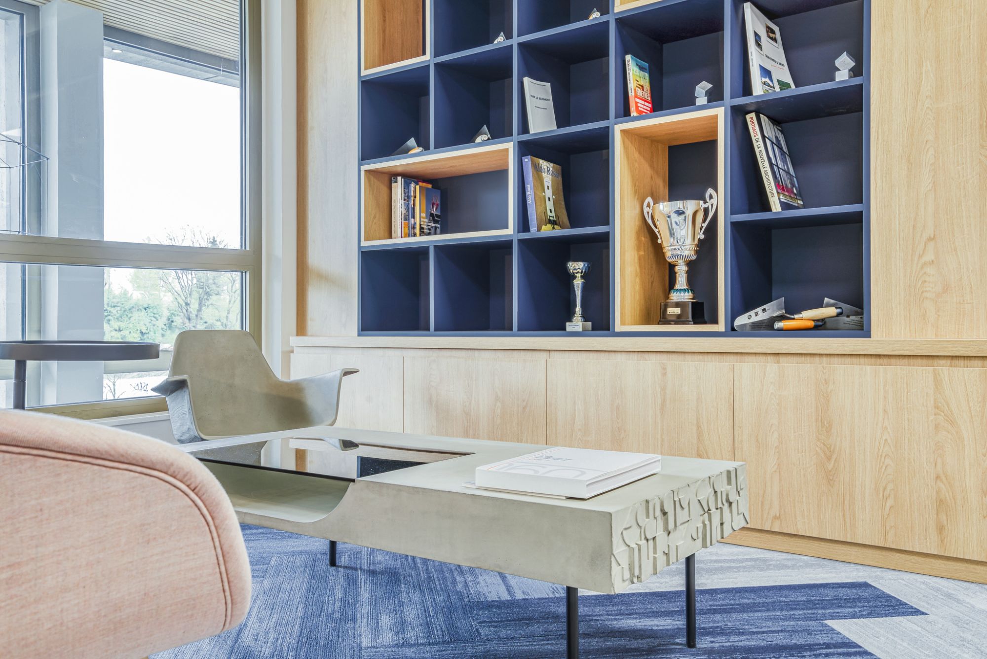Le projet comporte de nombreux agencements, ainsi que du mobilier sur-mesure comme cette table basse