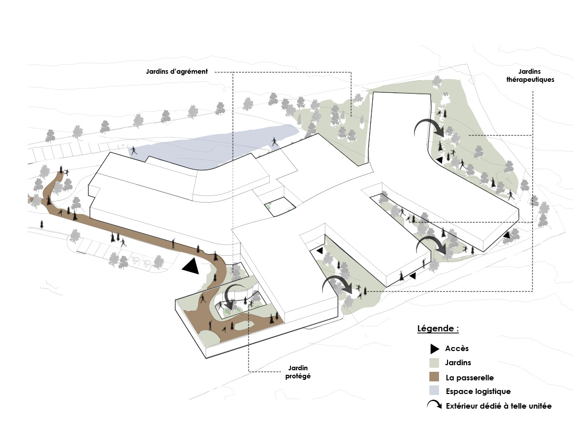 Le projet fait du végétal un véritable levier thérapeutique et climatique : jardins thérapeutiques, patios, esplanade arborée et cheminements extérieurs favorisent la mobilité douce et les moments de contemplation. Ces îlots de fraîcheur naturels participent à la régulation thermique et au confort des résidents les plus fragiles.