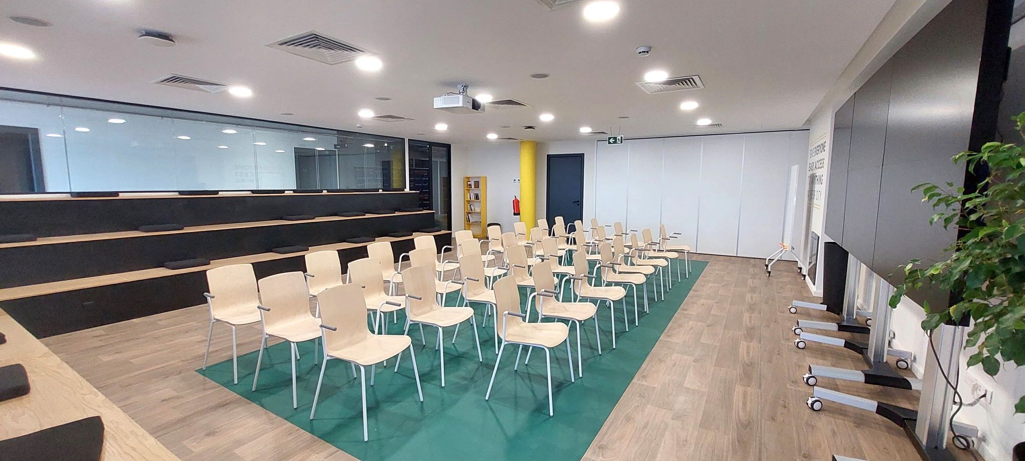 L’agencement intègre des solutions modernes telles qu’un faux plafond au style industriel, optimisant à la fois l’esthétique et la flexibilité pour répondre aux besoins de connectivité et de câblage des installations.