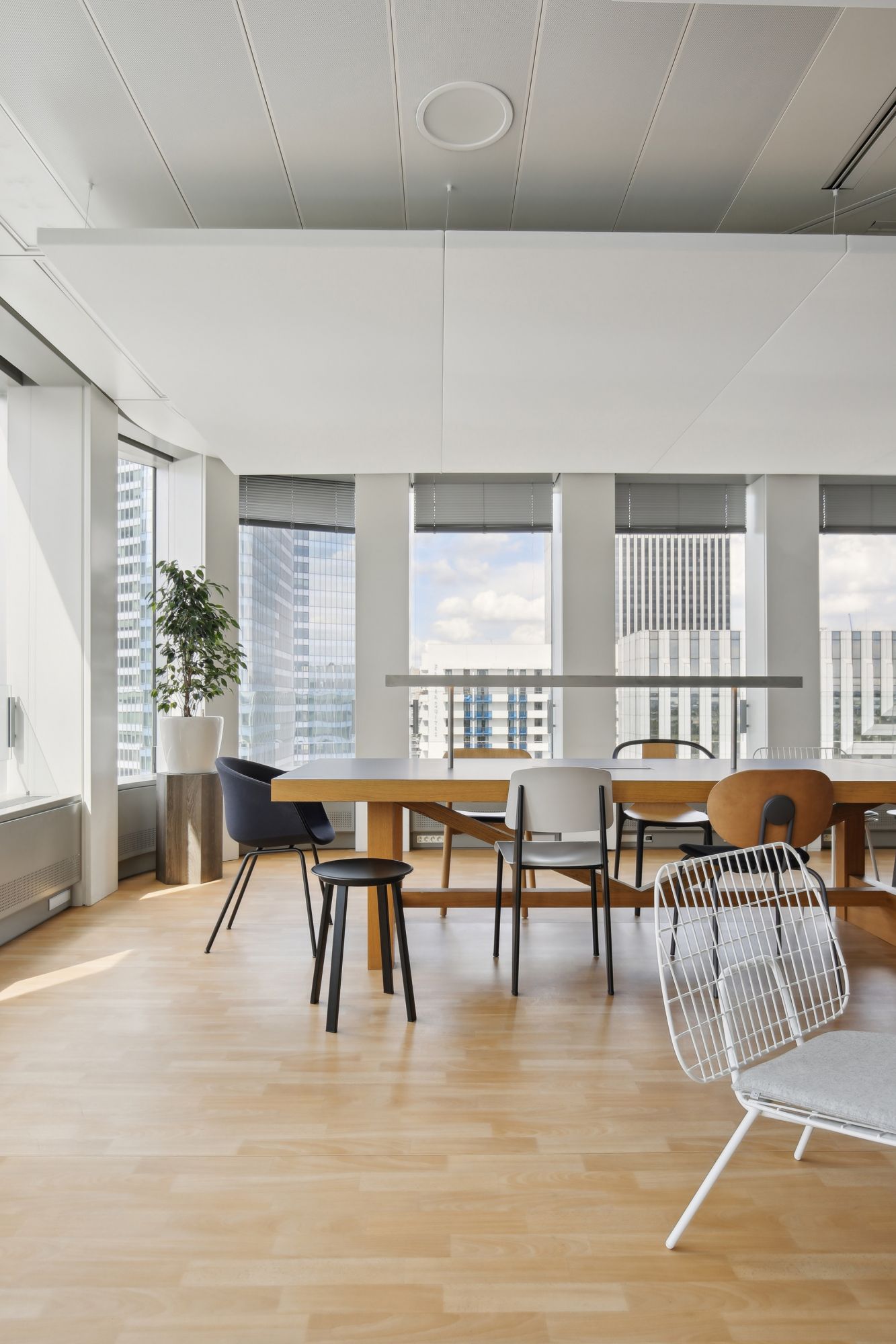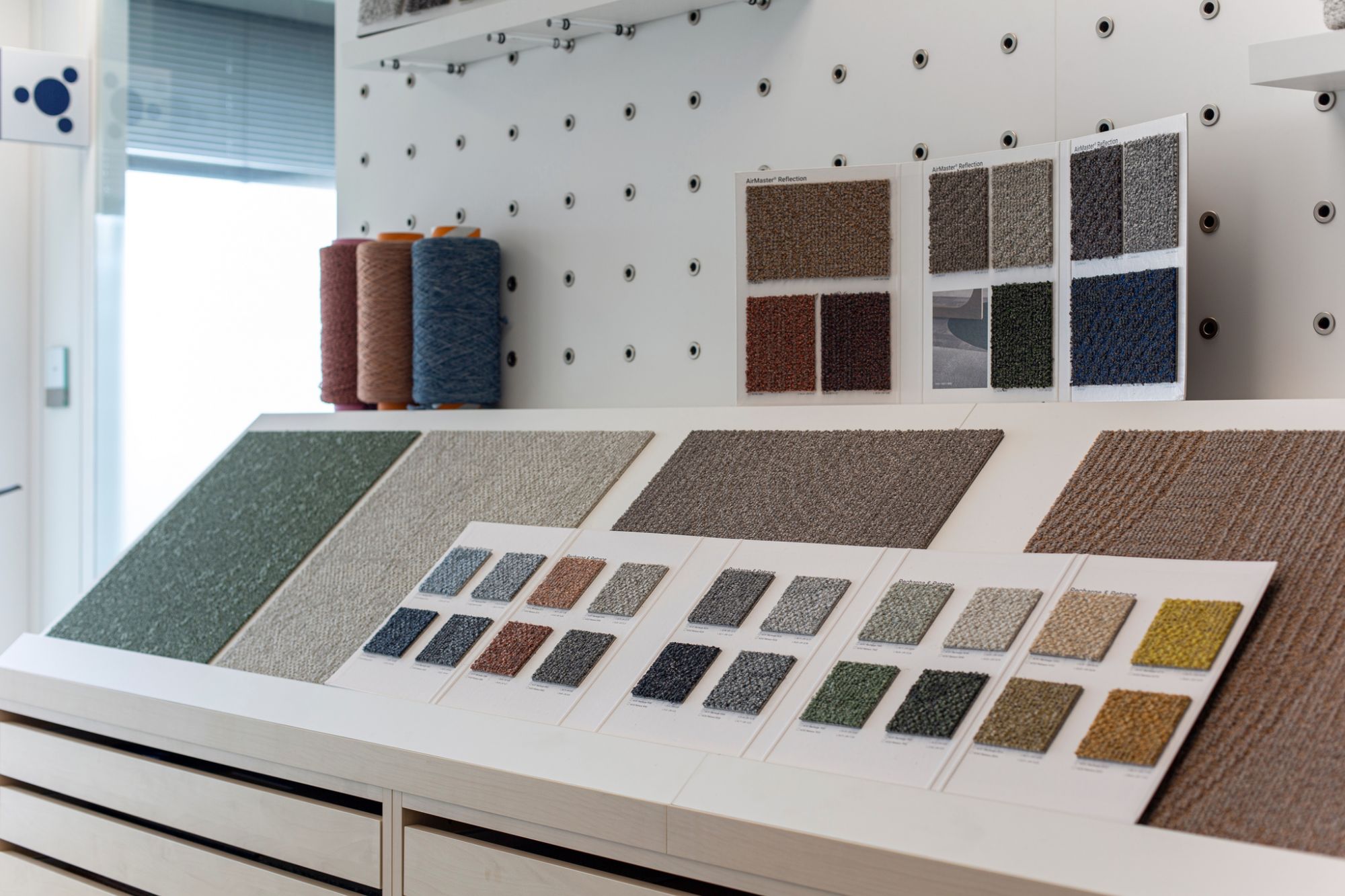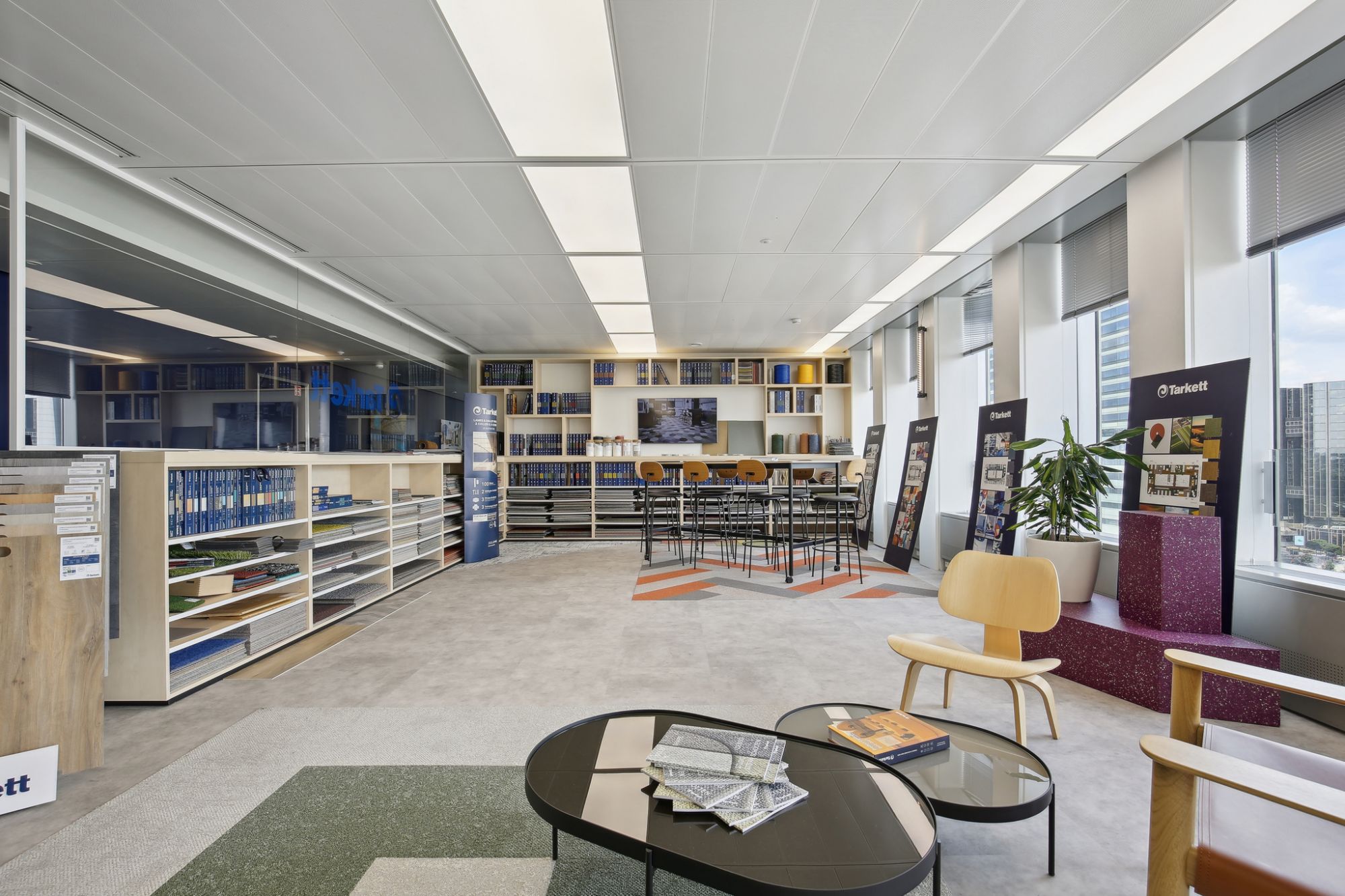 Implanté sur 7 étages dans la Tour Initiale, ce projet de 5 500 m² met en avant les matières Tarkett avec une cinquantaine de sols différents mais aussi un travail sur le détournement de la matière.