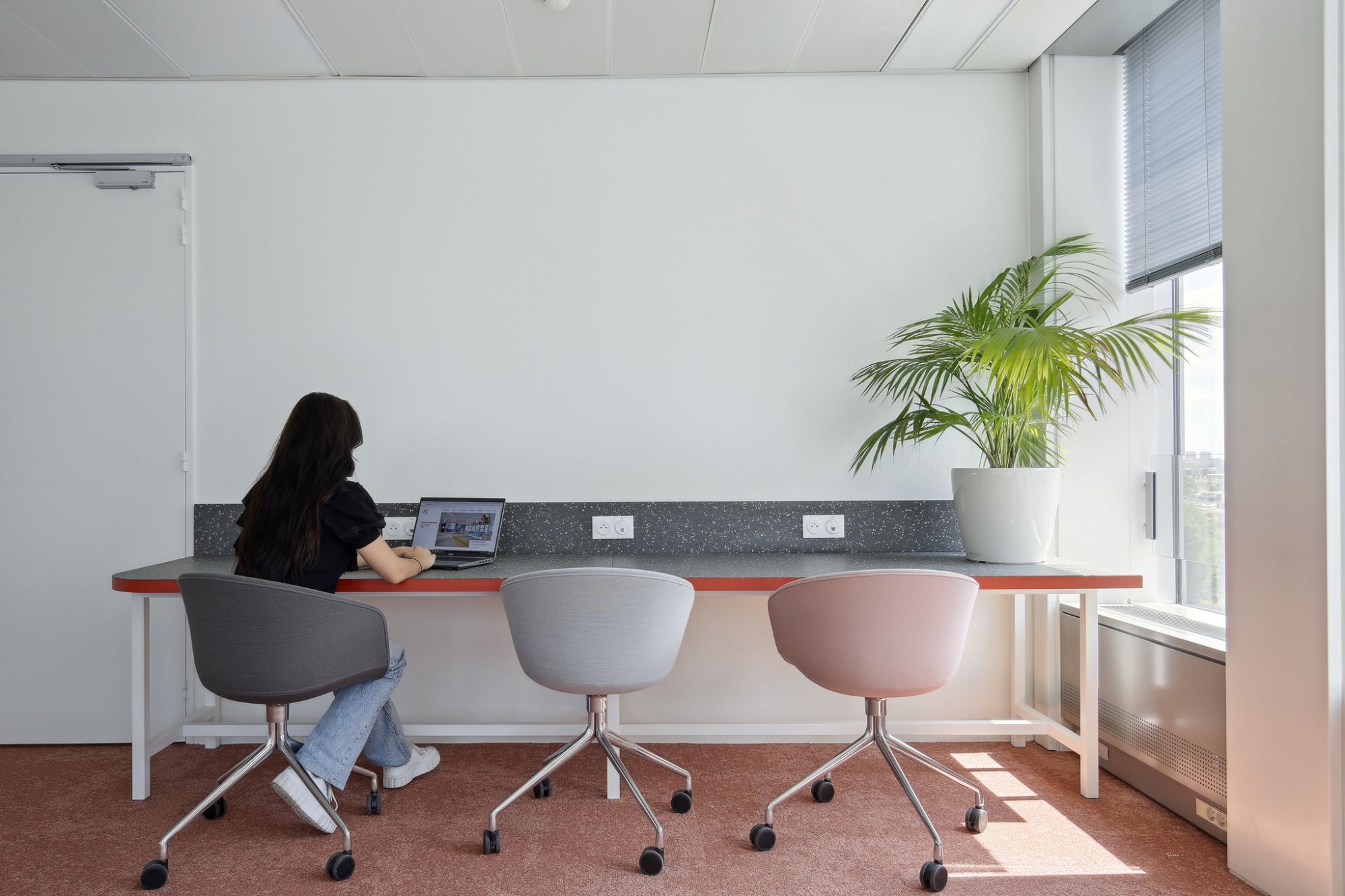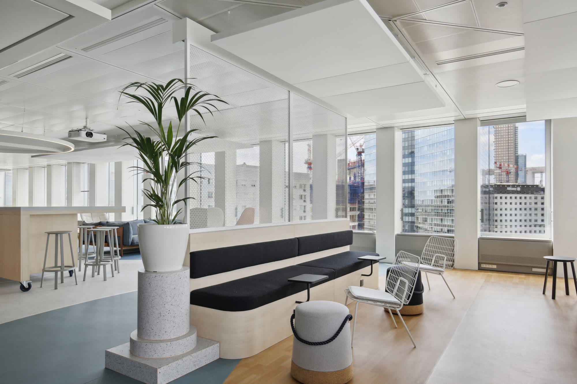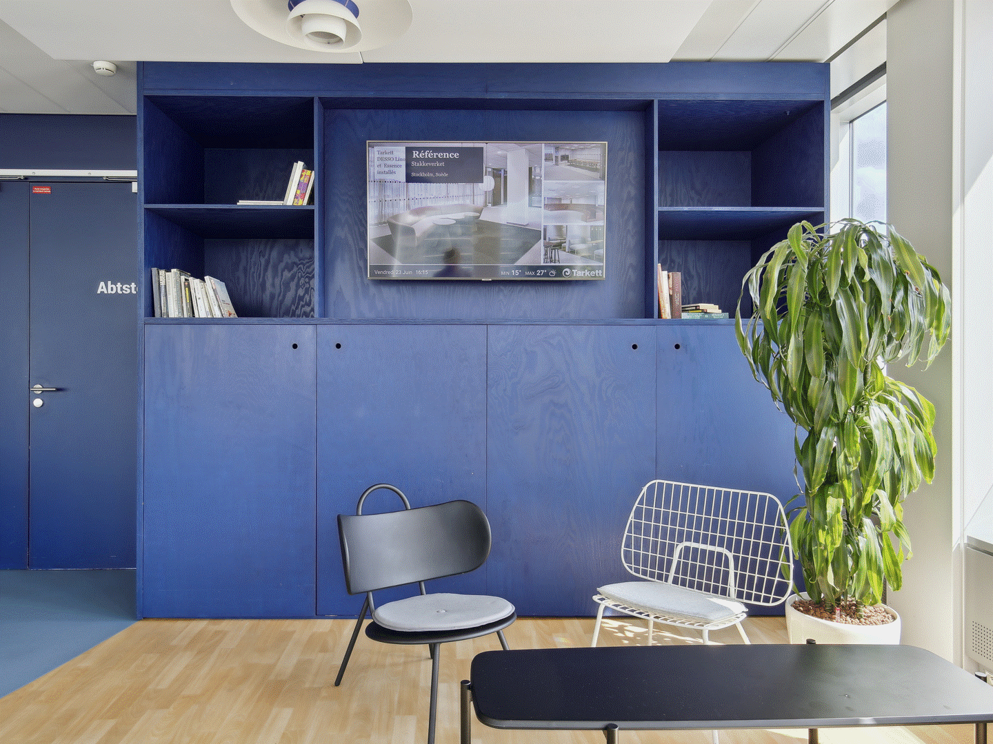 Implanté sur 7 étages dans la Tour Initiale, ce projet de 5 500 m² met en avant les matières Tarkett avec une cinquantaine de sols différents mais aussi un travail sur le détournement de la matière.