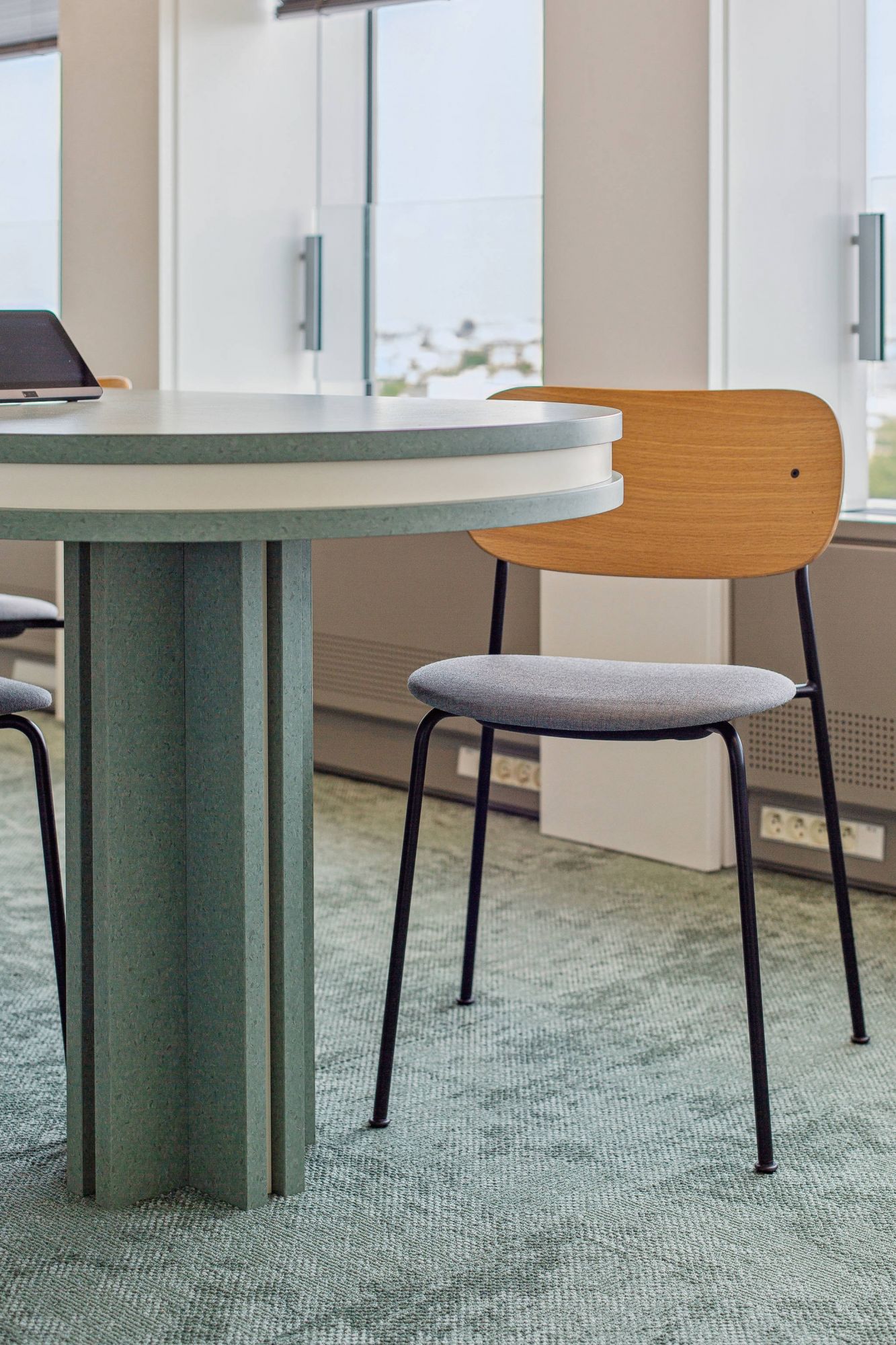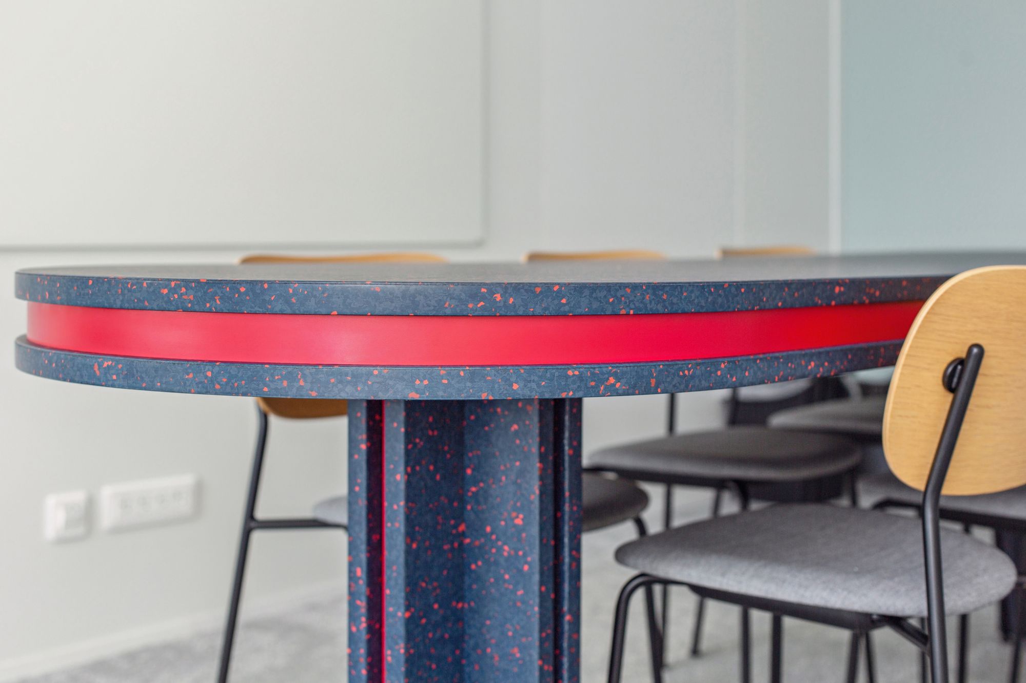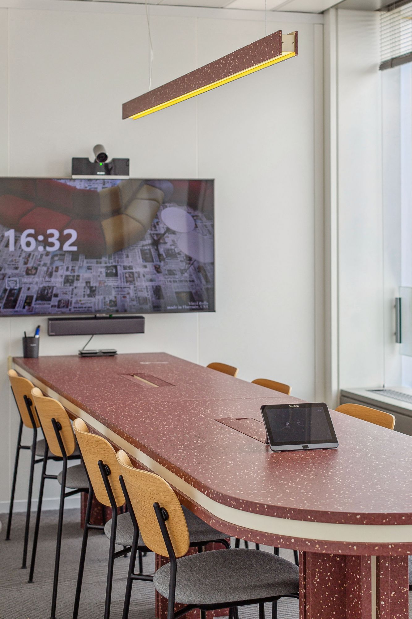 De multiples agencements ont pris place dans le projet, les tables de réunions ainsi que les luminaires associés ont été imaginés et réalisés en PVC Tarkett pour illustrer le potentiel et mettre en avant leur produit.